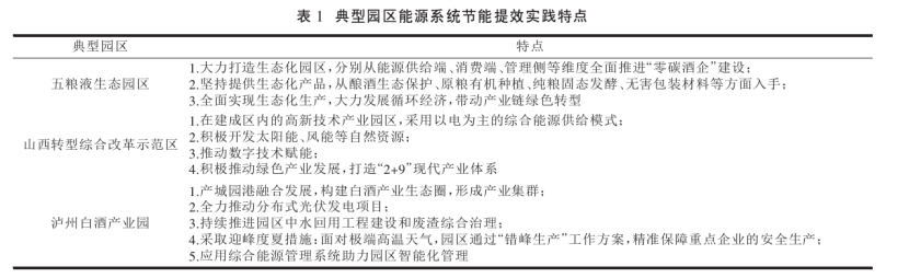 園區(qū)在推動(dòng)我國實(shí)體經(jīng)濟(jì)發(fā)展和城鎮(zhèn)化發(fā)展中發(fā)揮了關(guān)鍵作用,是支撐制造強(qiáng)國戰(zhàn)略的主戰(zhàn)場。有研究表明,園區(qū)二氧化碳排放量約占全國總排放量的31%[4],園區(qū)是資源能源消耗最集中的地方。現(xiàn)階段,為了節(jié)約能源,保護(hù)環(huán)境,我國各級(jí)園區(qū)都在持續(xù)推動(dòng)綠色低碳發(fā)展。田金平等研究指出我國工業(yè)園區(qū)節(jié)能提效實(shí)踐創(chuàng)新主要體現(xiàn)在以下5個(gè)方面: ①聚焦重點(diǎn)領(lǐng)域,全過程系統(tǒng)性推進(jìn)節(jié)能工作。②集中式能源基礎(chǔ)設(shè)施升級(jí)改造,多樣化開發(fā)利用余熱、 余壓和能量多級(jí)利用。③積極利用可再生能源,推進(jìn)能源結(jié)構(gòu)轉(zhuǎn)型升級(jí)。④積極開展智慧能源探索,實(shí)現(xiàn)能源全過程精細(xì)化管理。⑤建立健全能源管理體系。表1為典型園區(qū)能源系統(tǒng)節(jié)能提效實(shí)踐特點(diǎn)。