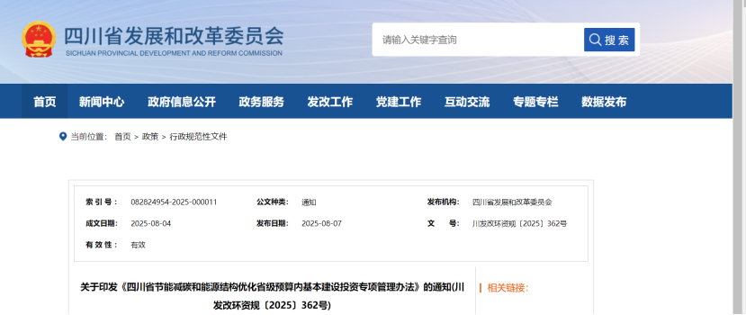 關(guān)于印發(fā)《四川省節(jié)能減碳和能源結(jié)構(gòu)優(yōu)化省級(jí)預(yù)算內(nèi)基本建設(shè)投資專項(xiàng)管理辦法》的通知(川發(fā)改環(huán)資規(guī)〔2025〕362號(hào))