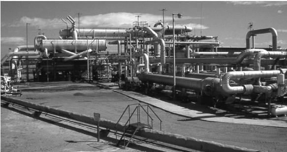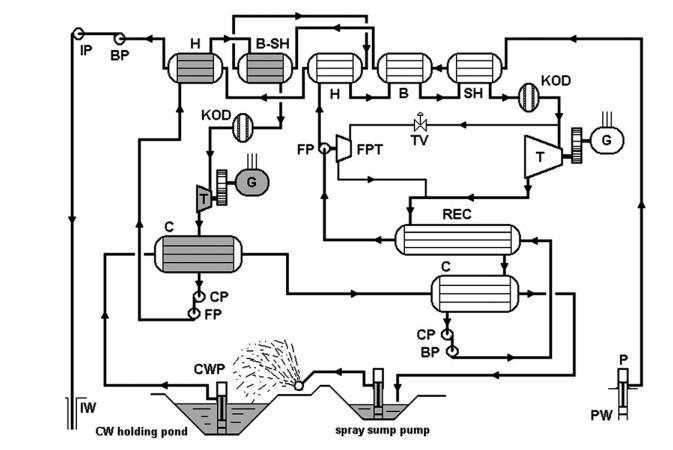 起初的電站使用的就是普通的雙循環(huán)地?zé)岚l(fā)電流程的機組。在優(yōu)化了1979年開始使用的發(fā)電機組以后,修整后的地?zé)犭娬臼且粋€完全不同的發(fā)電機組。以前的主渦輪機、真回流熱電轉(zhuǎn)換器、和交互蘭金循環(huán)都被還掉了。取而代之的是,一個簡單的,非提取異丁烷渦輪,和九個更大的鹵水熱電交換機。在熱電交換機的管道所在的一邊是鹵水,在殼側(cè)是碳水化合物。驅(qū)動沸騰給水渦輪的異丁烷來自于一個單獨的過熱器的側(cè)流。發(fā)電系統(tǒng)上安裝了一個降壓閥,來降低異丁烷的壓力以適應(yīng)BFPT的注入壓力。換熱器沒有更換,但是現(xiàn)在只是作為一個異丁烷循環(huán)的預(yù)熱器。丙烷循環(huán)現(xiàn)在也已經(jīng)獨立于異丁烷循環(huán)。