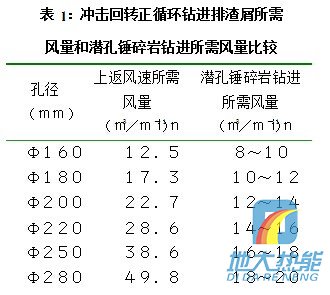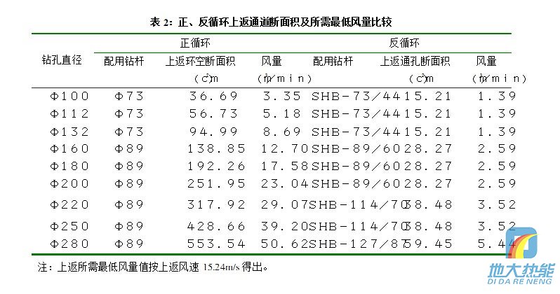 (1) 潛孔錘及雙壁鉆桿的中空斷面作為反循環(huán)通道,因斷面積小且直徑不變,在有限空 壓機供風(fēng)量條件下,可增大上返風(fēng)速,提高排渣能力,避免孔底重復(fù)破碎,從而提高鉆進(jìn)效率及增大孔深和孔徑;同時也不用經(jīng)常提拉鉆具吹孔,保持了鉆進(jìn)的連續(xù)性;