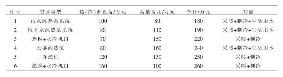 污水源熱泵與同類產(chǎn)品初投資比較(以1×104㎡為例)